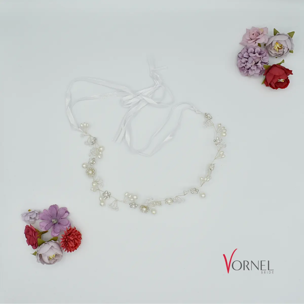 Das schmale Satinband wird von einem aufwendig verzierten Mittelteil mit Perlen und Kristallen geschmückt.