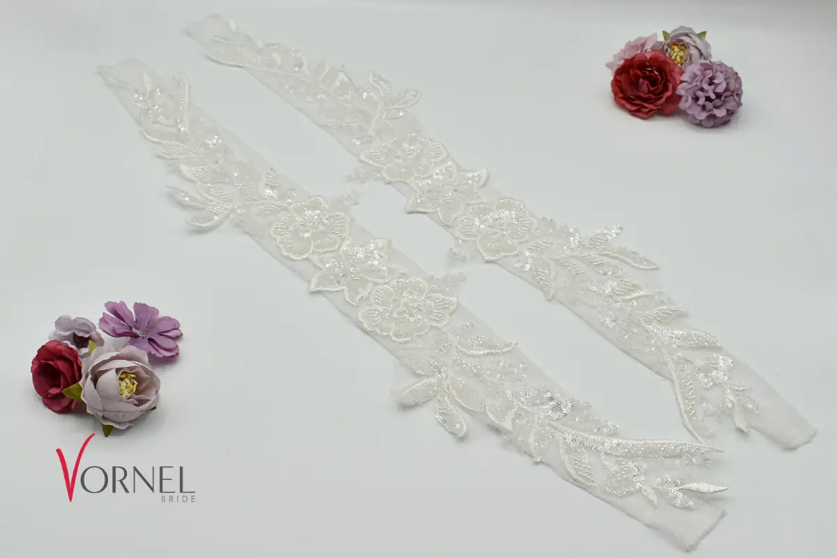 Mit einer Länge von ca. 51,5 cm und einer Breite von 5,5 cm verleihen sie dem Brautkleid eine romantische und zugleich auffällige Note.