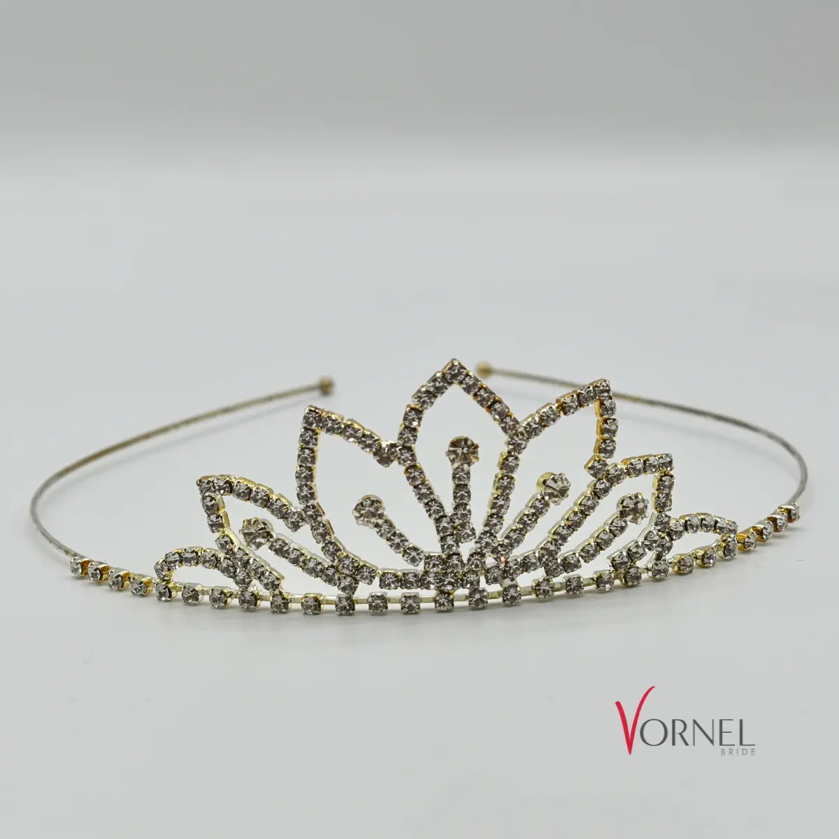 Dieses elegante Diadem kombiniert ein filigranes Design in Goldoptik mit funkelnden Strasskristallen.