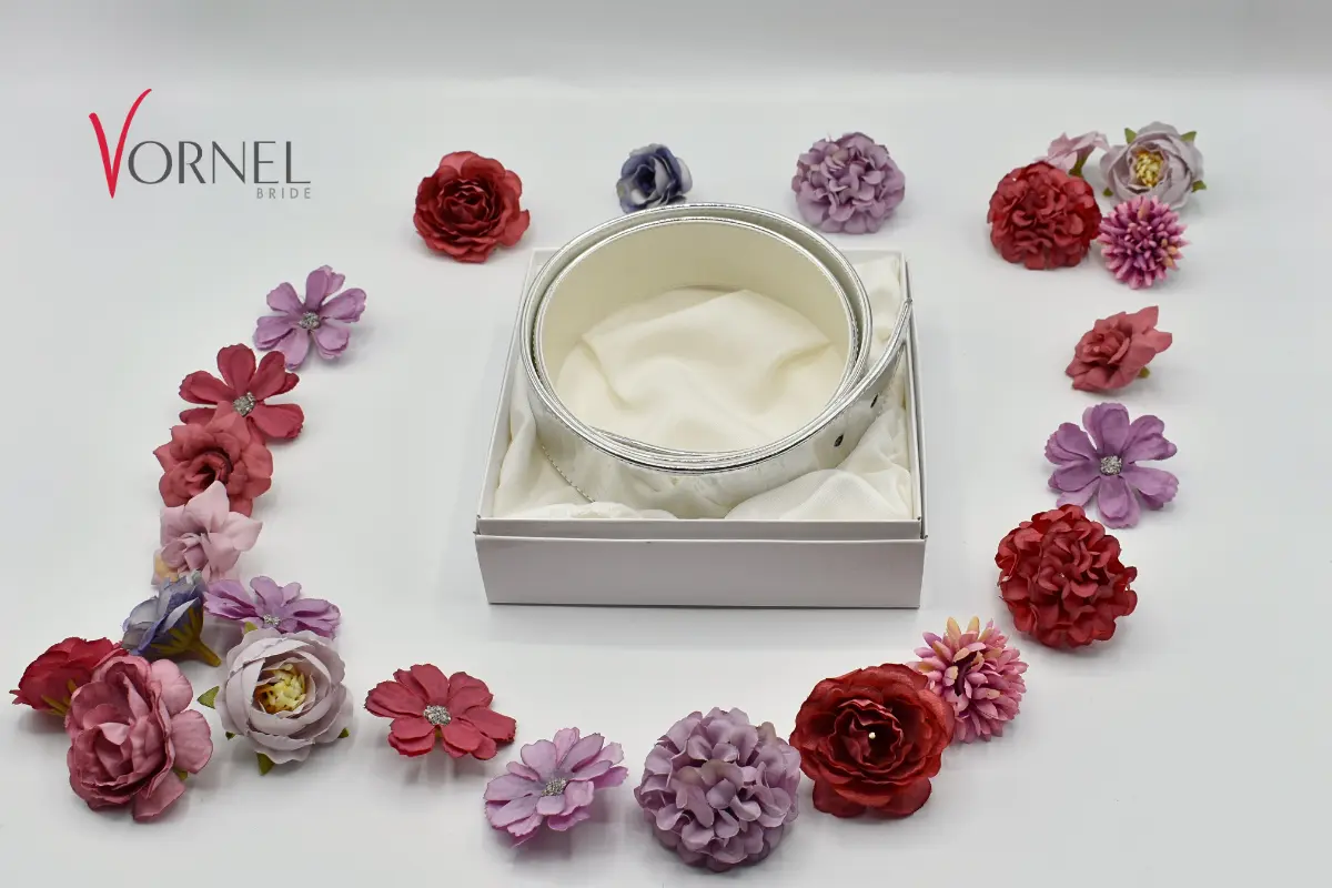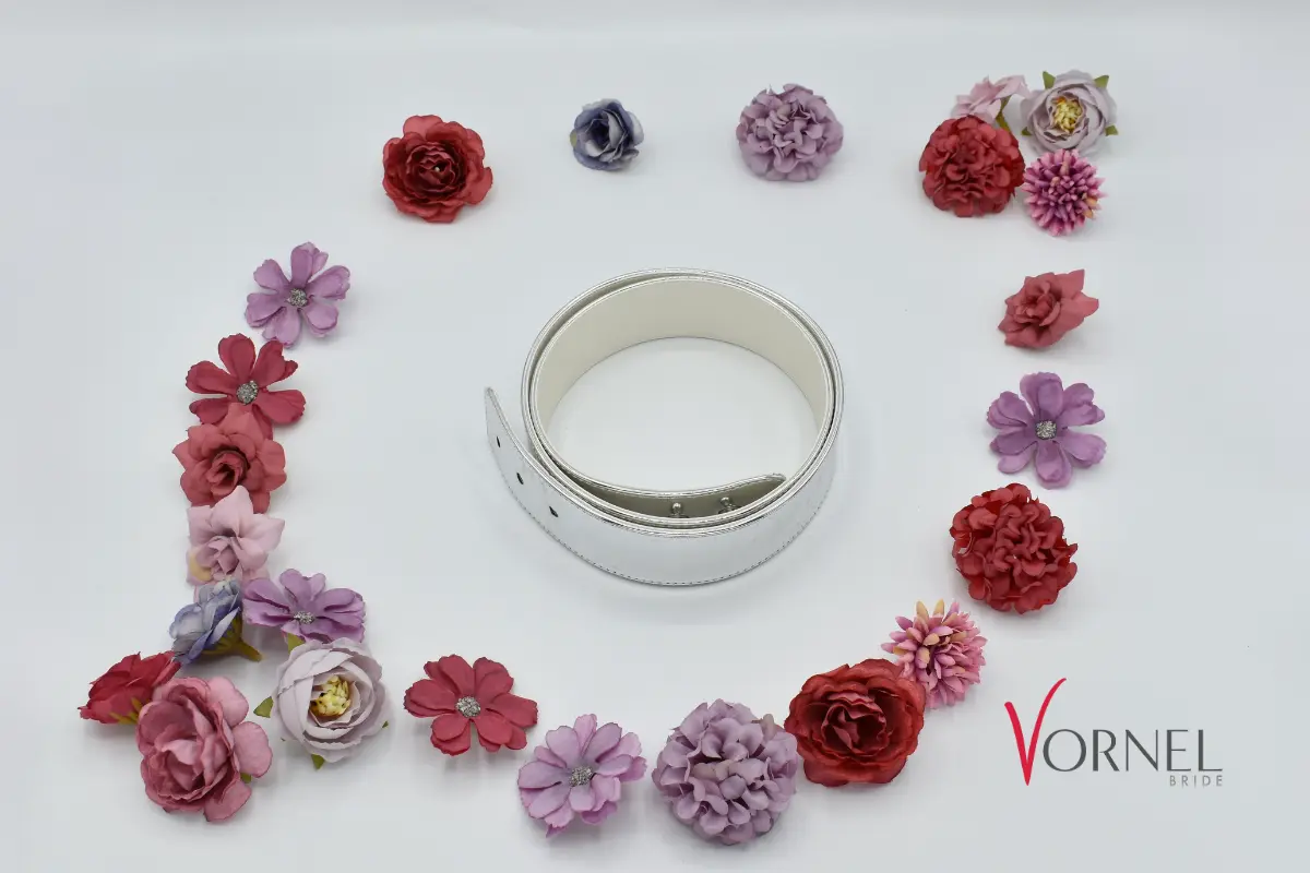 Schmaler Gürtel aus Kunstleder in glänzender Silberoptik.